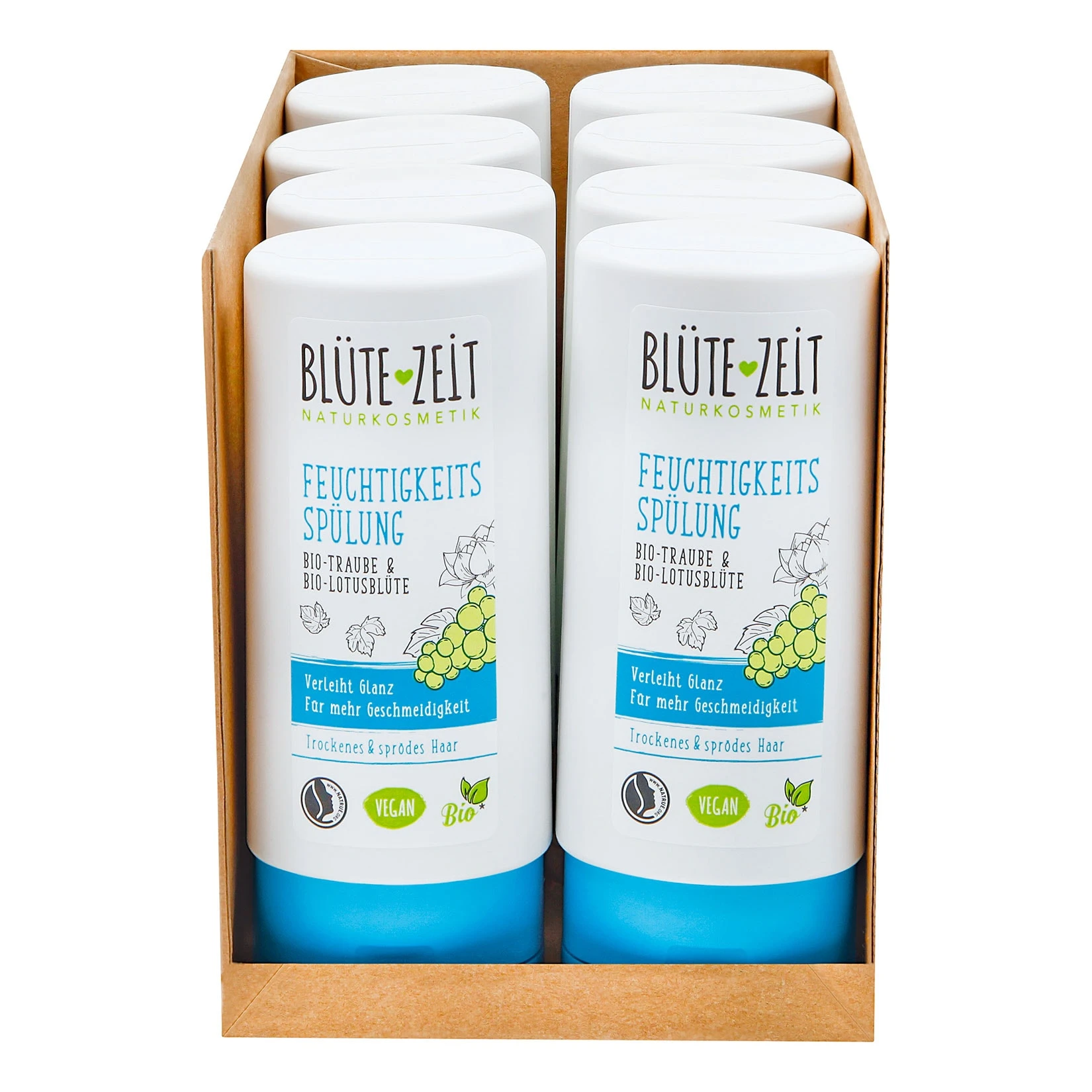 Natürliche Pflege nach dem Naturkosmetik-NATRUE Qualitäts-Standard für Ihre tägliche Beauty-Routine, Bio-Inhaltsstoffe und herrliche Duftaromen aus der Pflanzenwelt: Das alles bietet BLÜTE-ZEIT Naturkosmetik ohne Wenn und Aber. Die BLÜTE-ZEIT Feuchtigkeits Spülung mit Bio-Traube und Bio-Lotusblüte wirkt einer Austrocknung der Haare entgegen. Die Pflegeformel mit ihren sorgfältig abgestimmten Inhaltsstoffen, wie Bio-Traubenkern-Öl und Bio-Lotusblüten-Extrakt, pflegt die Haarstruktur vom Ansatz bis in die Spitzen. Für wunderbar gepflegtes und leicht kämmbares Haar.